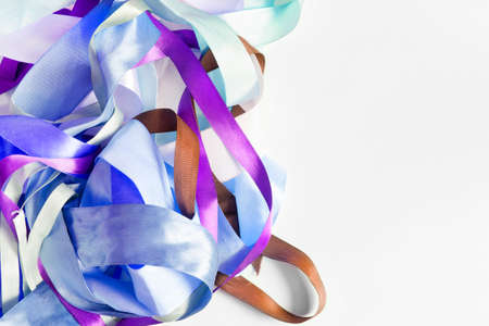 Blue and purple tangled satin ribbons on white background