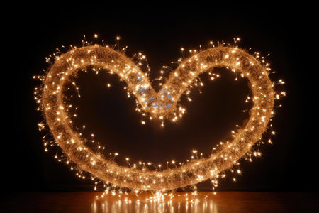 A heart shape formed by glowing string lights on a sandy beach illuminated against the night sky