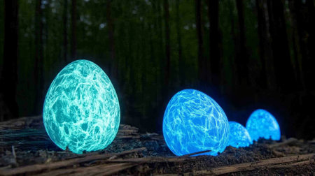 Glow in the dark eggs for evening fun. Three glowing eggs with intricate floral and butterfly patterns, illuminated in vibrant blue and orange hues, on a dark background