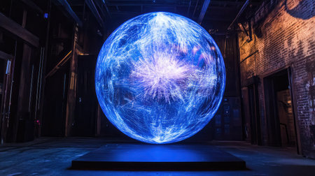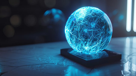 A holographic sphere projecting complex data streams in a high-tech environment.