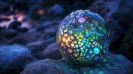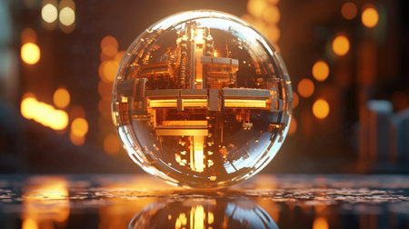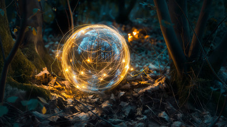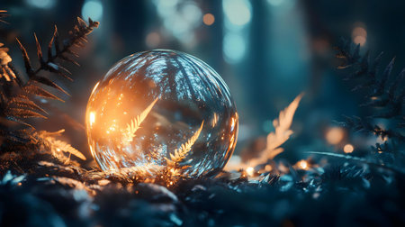 A mesmerizing glass sphere rests in a mystical forest, reflecting the surrounding trees and emitting a soft, golden glow.