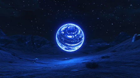 A stunning blue planet glows against a dark, starry sky, set within a surreal landscape that evokes a sense of wonder and cosmic mystery.