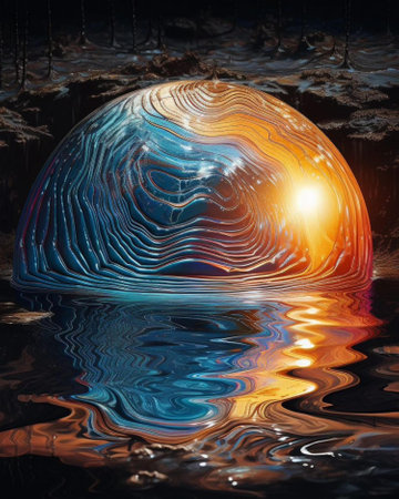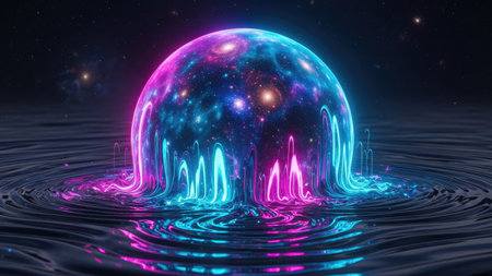 An abstract digital artwork depicts a glowing sphere with neon blue and pink lights, rising from a rippling water surface. The composition features a dark background with faint stars, creating a sense of depth and mystery. This image could be suitable for digital art, design projects, or conceptual illustrations.