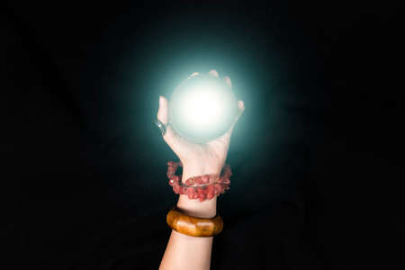 Fortune teller or witch hand and a glowing magic ball isolated on black background. Halloween, magic or witchcraft and tricks concept