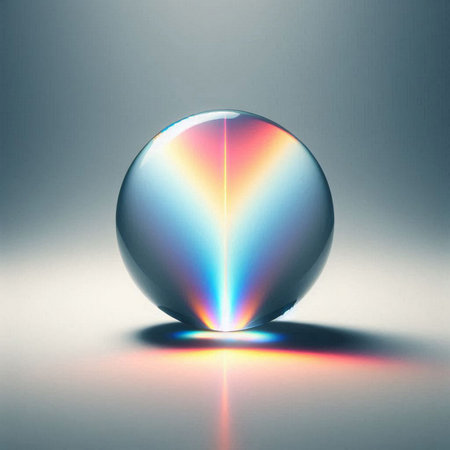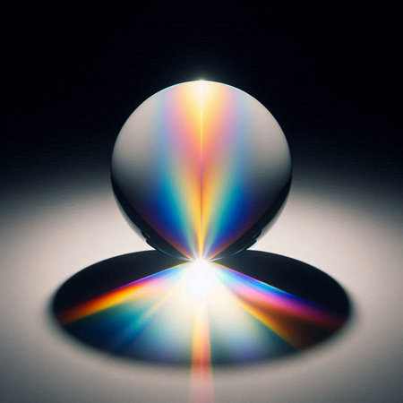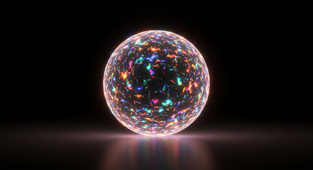 Glass sphere with colored light reflections on a dark background close up.