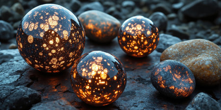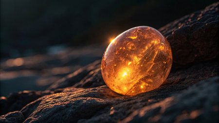 A stunning amber sphere shines brightly on a rough surface as evening light creates a warm glow.