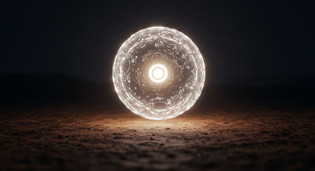 A glass sphere with an orange light emanating from its base sits on a dark surface