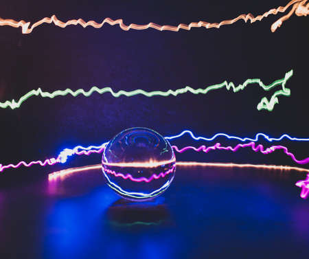 Neon color light trails reflected in crystal, lens ball with blue background.