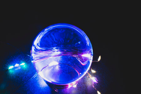 Led color lights reflected in crystal ball with dark background.