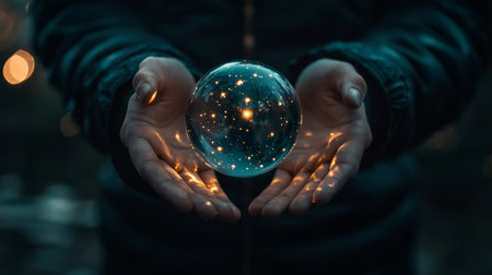 A person is skillfully holding a beautiful crystal ball gently in their hands, showcasing its stunning reflection and mesmerizing patterns in it