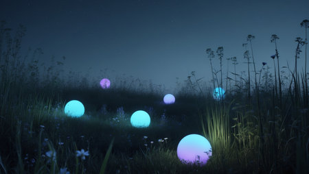 AI Generated. Glowing orbs illuminate a dark meadow during Earth Hour celebration in a serene nature setting