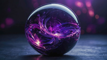 Magic abstract crystal purple energy sphere ball with particles and glowing lines on dark background.