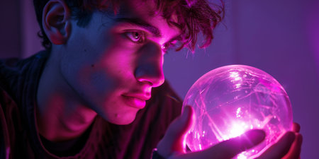Photo of an Intrigued Young Man Gazing Intently at a Glowing Orb.