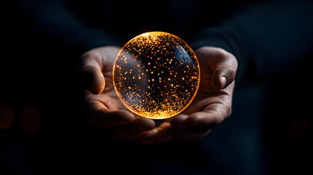 A glowing golden sphere surrounded by sparks, held delicately in both hands against a dark background, creating an enchanting and mysterious atmosphere of wonder and creativity.