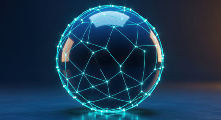Global network sphere, illuminated connections, dark background, digital art