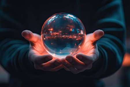 The hands cradle a glowing orb that reflects a futuristic cityscape, symbolizing advanced technology and innovation.