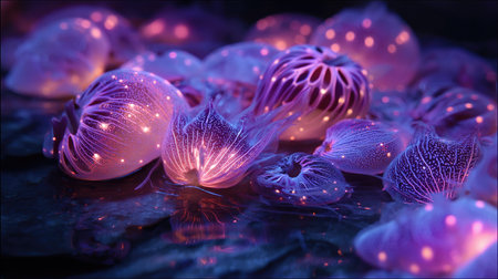 Artistic shot of glowing seashells floating in water under blacklight, creating a surreal marine effect