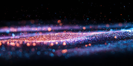 showing scattered glittering particles in pink purple and yellow hues on a dark black background with soft...