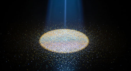 A diagonal golden light beam cuts across a dark gradient background, filled with sparkling particles and soft bokeh effects.