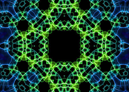 A vibrant neon geometric mandala pattern with swirling lines of blue, green, and orange creating a symmetrical design.