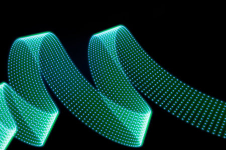 Turquoise green neon wave of light as curls, swirl or spiral with dotted stripes on black background. Abstract background with dynamic line in motion, light painting in modern style.