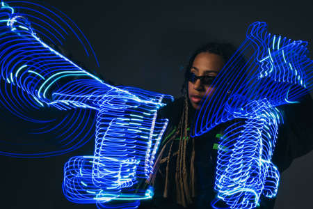 Portrait of man with neon glow tube lines with smoke on his face in dark. Concept cyberpunk and virtual reality