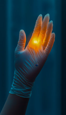 A gloved hand extends forward, emanating a radiant, pulsating core of energy that illuminates the surrounding space with a mystical glow.