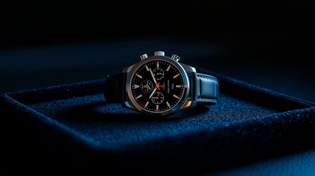 Luxury Design Black Wristwatch Chronograph Lit Dramatically from Side on Dark Background with Glowing Effect