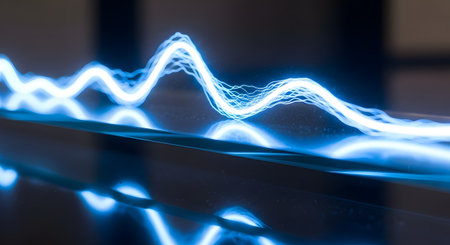 Curved digital waveform graph showing sharp peaks and smooth dips, glowing in a sci-fi blue hue.