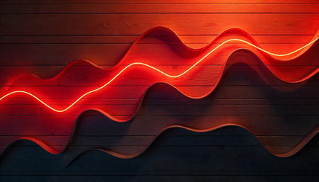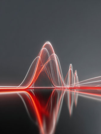 Vibrant red and white luminous currents ripple across a sleek surface, mirrored reflections enhancing a sleek, high-tech ambiance against a subtle gradient backdrop.