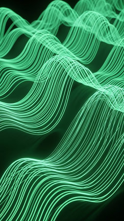 An abstract pattern of luminous green wavy lines creates a dynamic, flowing effect against a dark background, suggesting energy or data transmission.