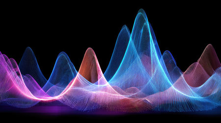 This image features vibrant, abstract waveforms composed of glowing lines against a stark black backdrop. The composition showcases dynamic movement and flowing shapes, utilizing a color palette of electric blues, pinks, and oranges. Suitable for commercial projects or editorial content, it could represent various technological or scientific concepts.
