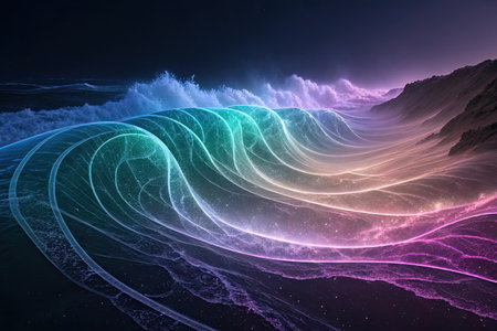 Waves crash with luminous colors at nighttime, creating a stunning display along the shoreline.