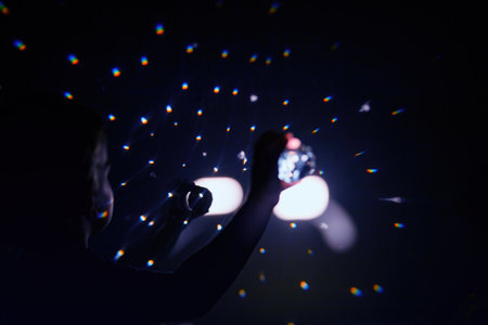 Nighttime joy: Toddlers light play with glass in futuristic environment