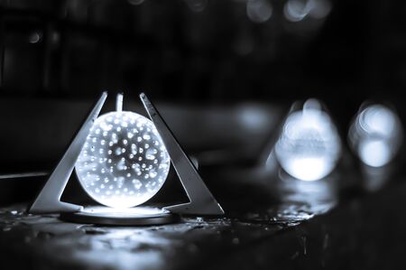 A glass sphere with an orange light emanating from its base sits on a dark surface