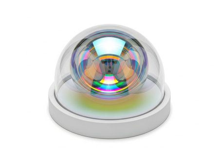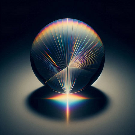 The image showcases a reflective spherical prism placed on a white base. The prism captures and refracts light, creating a mesmerizing display of rainbow colors. The spherical shape and clear material of the prism allow for a vivid spectrum of colors to be reflected and refracted, creating a visually appealing effect. The white base provides a stark contrast, enhancing the visibility of the colorful reflections.