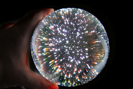 Neon color light trails reflected in crystal, lens ball with blue background.