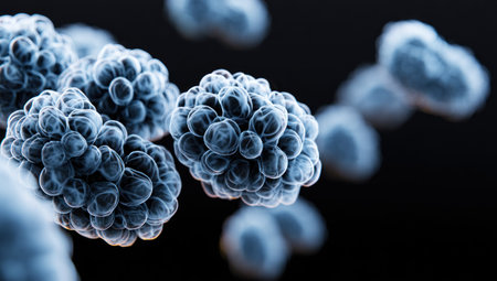 Microscopic, clustered sphere-like structures, glowing blue against a dark background
