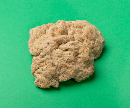 Raw dehydrated soy meat or soya chunks on green background top view. Texturized vegetable protein, also known as textured soy protein or TSP