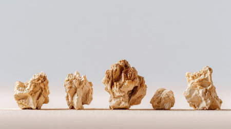 Shot of four light beige, textured forms in a horizontal arrangement. The forms are of varying sizes and exhibit an irregular, natural shape. They sit on a light beige surface. The background is a pale gray.