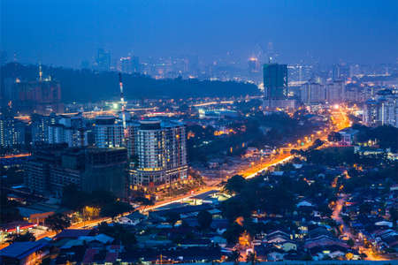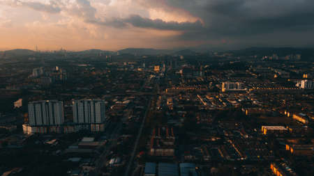 Aerial view of the sunset with urban architectures and city. View of the suburban town in Malaysia.