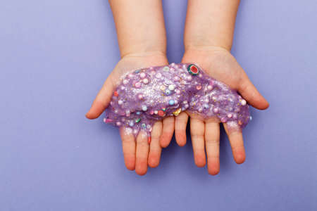 Making slime at home. child holding and stretching colorful slime. DIY concept