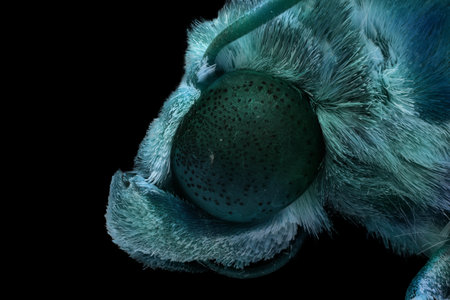 Macro photography of head of colorful moth isolated on black background.