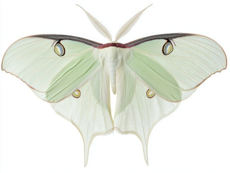 tranquil moment reveals a luna moth at rest, showcasing its delicate, pale green wings adorned with intricate details, isolated beautifully on a white background.