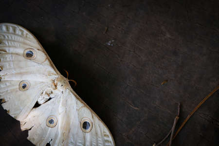 cream moth on dark wood background have spot on wings was staff from 2017 and found in Samoeng mountain at Chiang Mai, Thailand