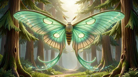 A magical green moth holds a glowing rectangle in a mystical forest