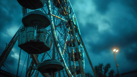Colorful cabins ascend as people enjoy the thrill of the ferris wheel under the evening sky