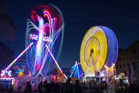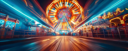 Colorful ferris wheel illuminated at night. Mesmerizing light trail effect at a lively carnival with vibrant attractions