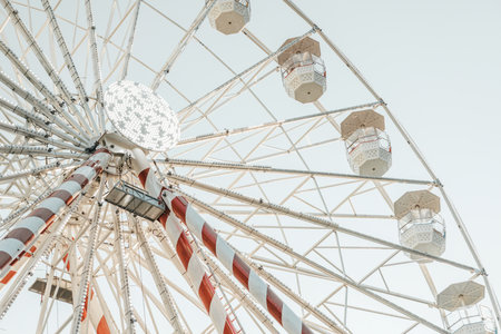 A close-up view of a Ferris wheel displays brightly colored passenger cabins. The metal structure contrasts with the clear blue sky. The composition emphasizes the repetitive forms and radial symmetry of the wheel, possibly suitable for promotional materials or editorial content.