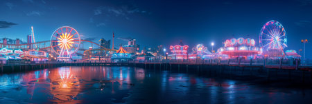A brightly lit Ferris wheel and amusement park rides glow against the night sky, creating a vibrant and festive atmosphere.